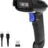 A versatile 1D barcode reader with a battery level indicator, offering both 2.4Ghz wireless and USB wired modes with a transmission distance of 328 feet. This rechargeable handheld scanner is highly reliable.